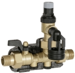 Gehäuse aus entzinkungsbeständigem Messing, mit Verschraubungen. Bestehend aus 1 Kugelabsperrventil, Sicherheitsventil, Rückflussverhinderer mit Prüf- und Entleerungsstopfen